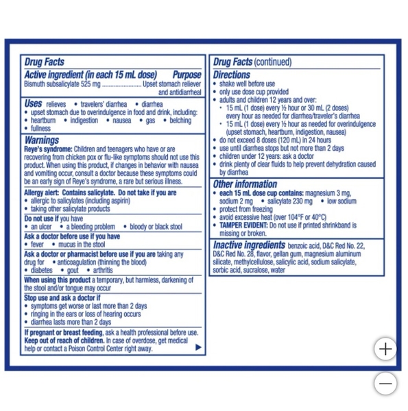 - Bismuth Subsalicylate, Water, Flavor,Benzoic Acid, Methylcellulose, Red 22, Magnesium Aluminium Silicate, red 28, Salicylic Acid, Sodium Salicylate,Saccharin Sodium, Sorbic Acid.