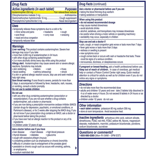 – Người lớn và trẻ em từ 12 tuổi trở lên: Uống 2 viên hòa tan hoàn toàn trong 4 oz. (110ml) nước cứ sau 4 giờ.